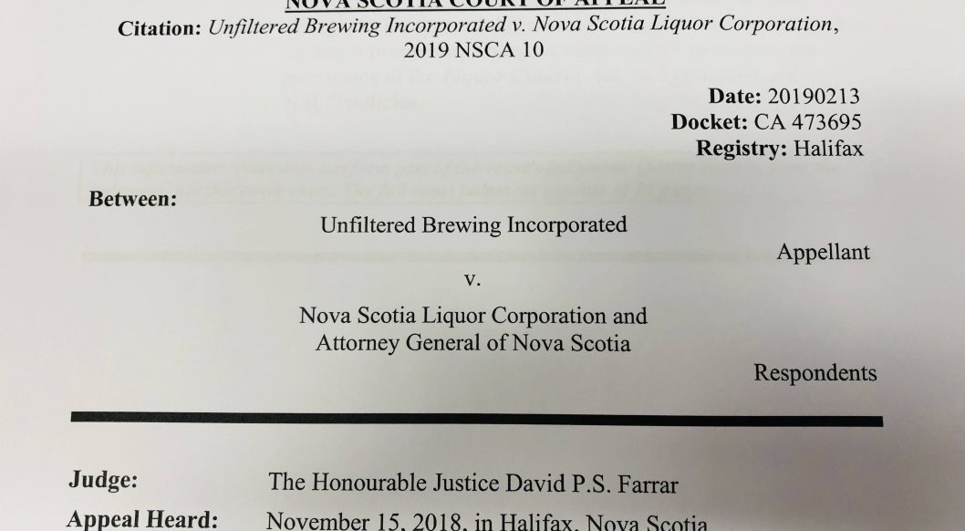 On February 13, 2019 the Nova Scotia Court of Appeal released its reasons in Unfiltered Brewing Incorporated v. Nova Scotia Liquor Corporation. Those reasons can be read in full here. The appeal was dismissed, with costs ordered payable by Unfiltered Brewing to the Attorney General of Nova Scotia. The trial judge’s reasons are summarized here.